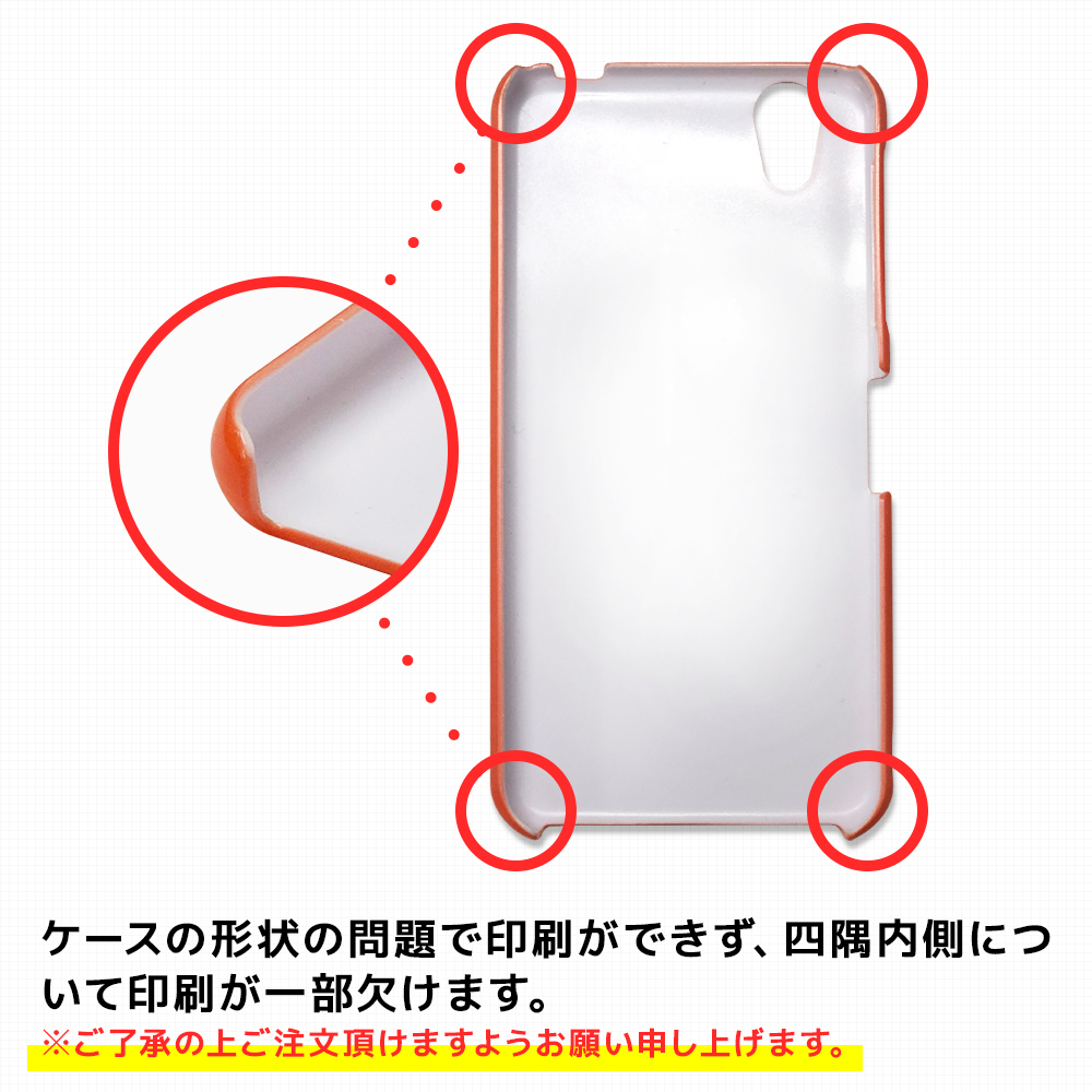 ケースの形状の問題で印刷ができず、四隅内側について印刷が一部欠けます。